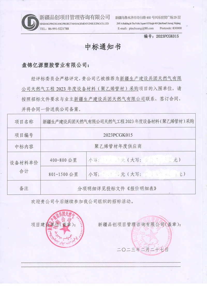 2023年2月27日,盤錦億源塑膠管業有限公司憑借綜合實力成功中標新疆生產建設兵團天然氣有限公司天然氣工程2023年度設備材料(聚乙烯管材)采購項目。